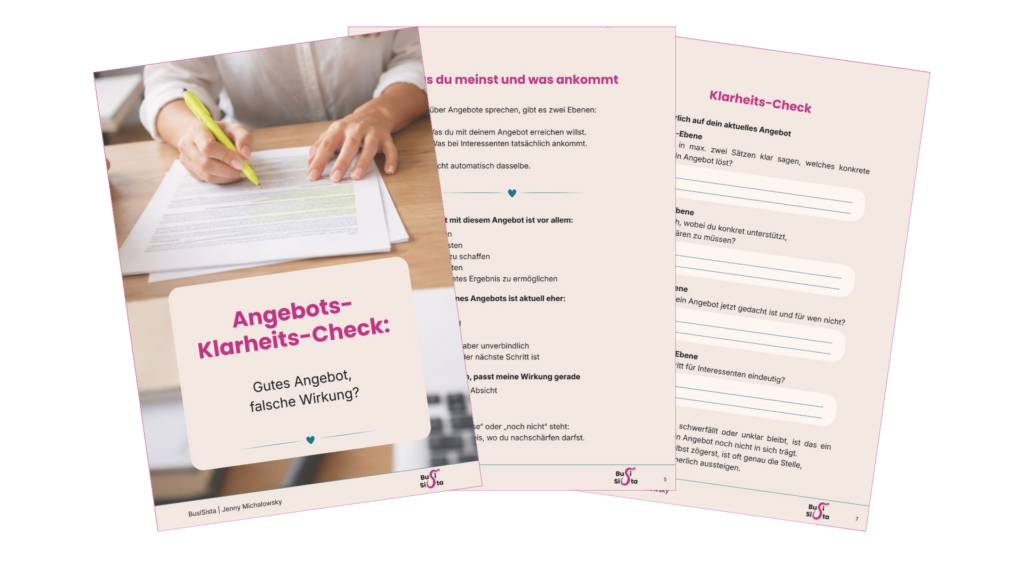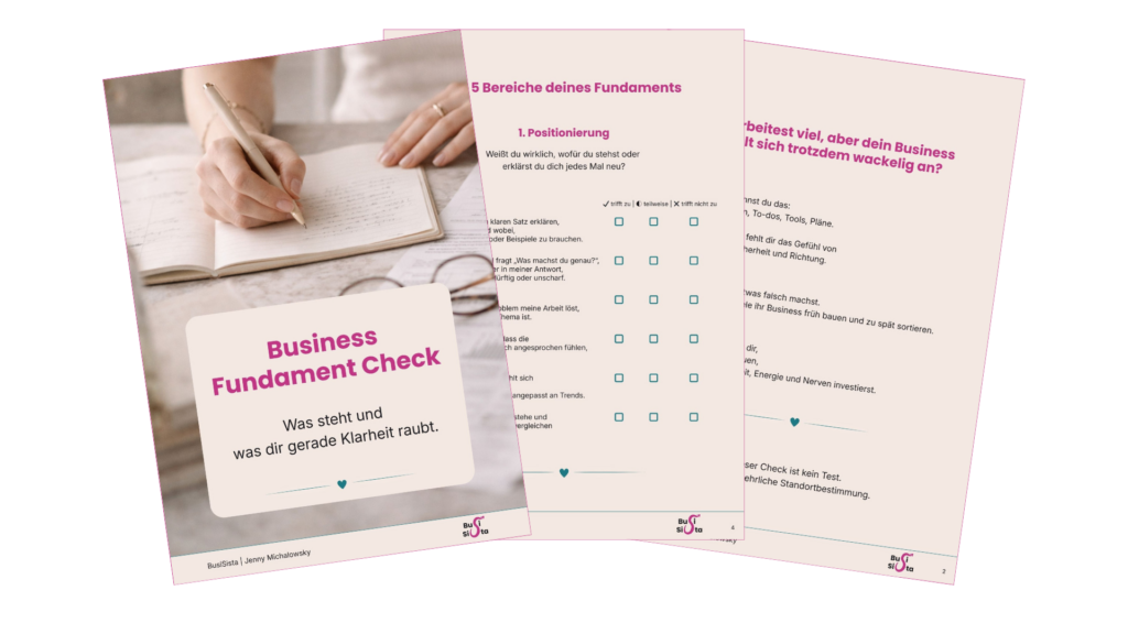 Die folgenden kostenlosen Einstiege helfen dir, dein Business als Ganzes einzuordnen. Du erkennst, was bereits trägt, wo Klarheit fehlt und welche Schritte im Aufbau jetzt sinnvoll sind, damit Sichtbarkeit und Verkauf nicht zufällig bleiben.
