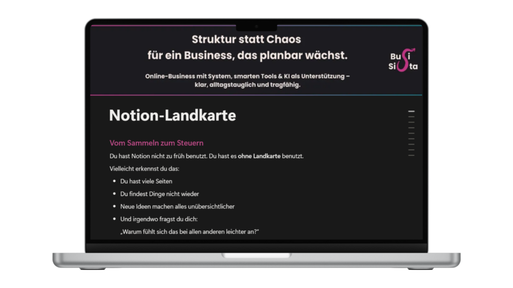 In diesem Bereich geht es um Struktur im Arbeitsalltag. Um deine Schaltzentrale in Notion, in der dein Business geführt wird.