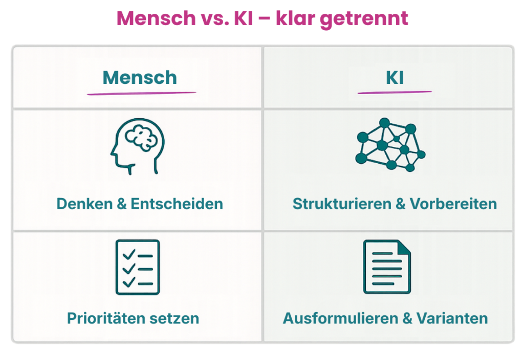 - Nutzungslogik – eine bewusste Entscheidung, wofür KI eingesetzt wird und wofür nicht